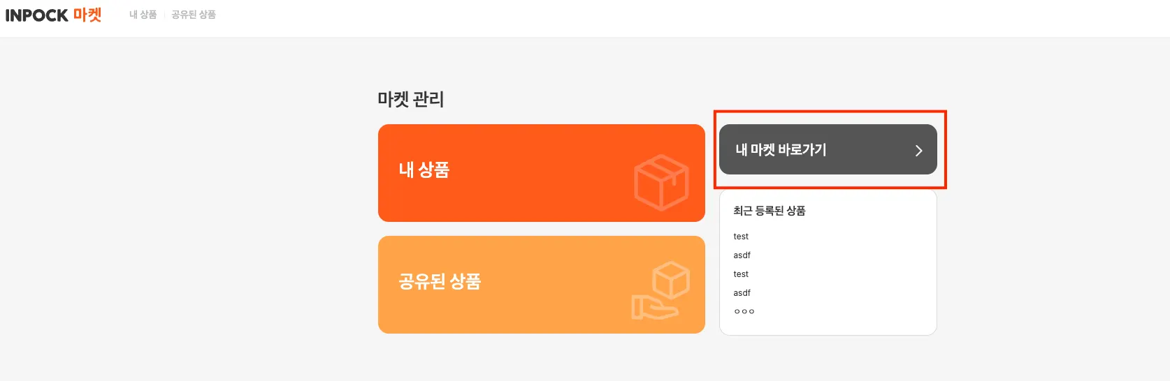 마켓 메인 페이지에서 “내 마켓 바로가기” 버튼을 찾을 수 있어요. 클릭하면 내 마켓의 판매 페이지를 바로 확인할 수 있습니다.