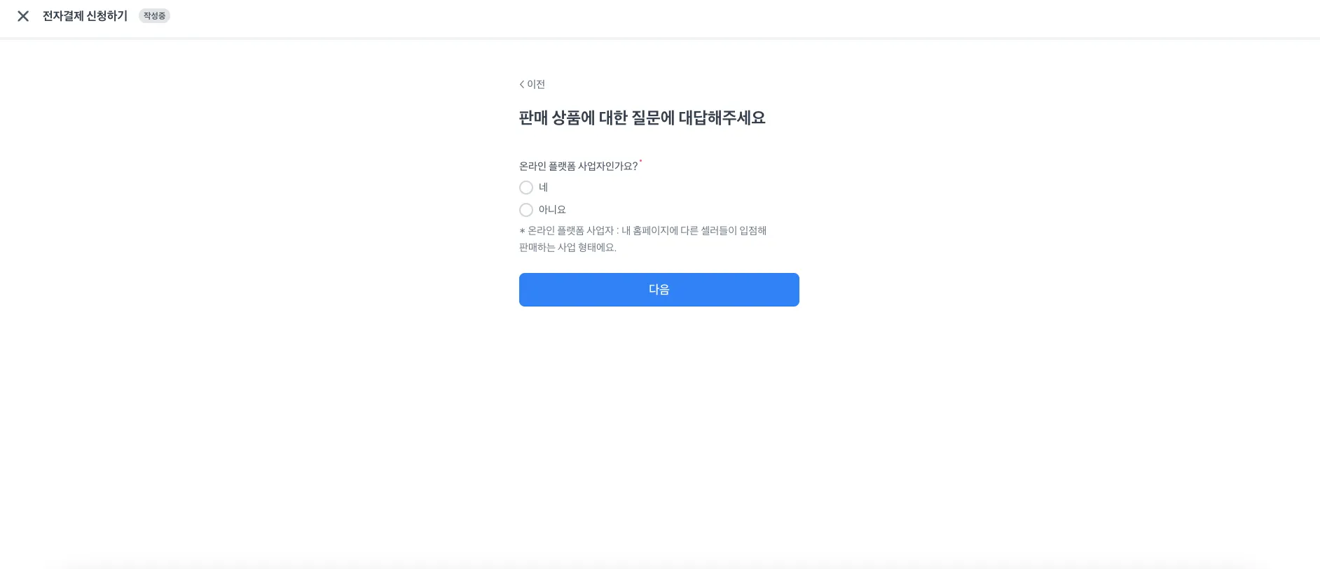 다른 사업자가 아닌 자신의 사업자만 판매한다면, "아니요"를 선택해 주세요.