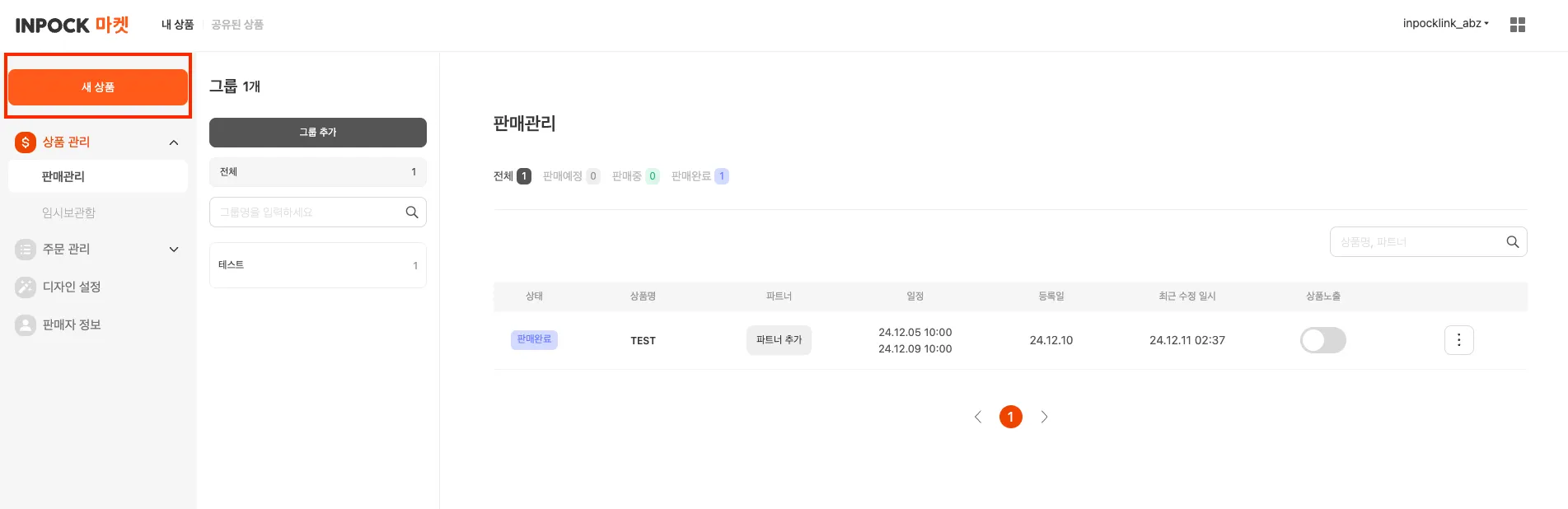 좌상단의 [새 상품] 버튼을 눌러 시작합니다.