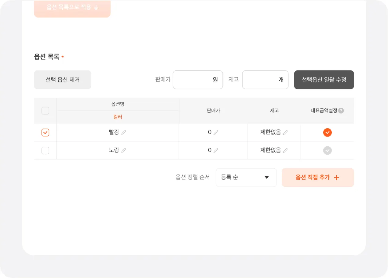 선택옵션 일괄 수정: 선택한 옵션의 판매가와 재고를 일괄 수정할 수 있어요!