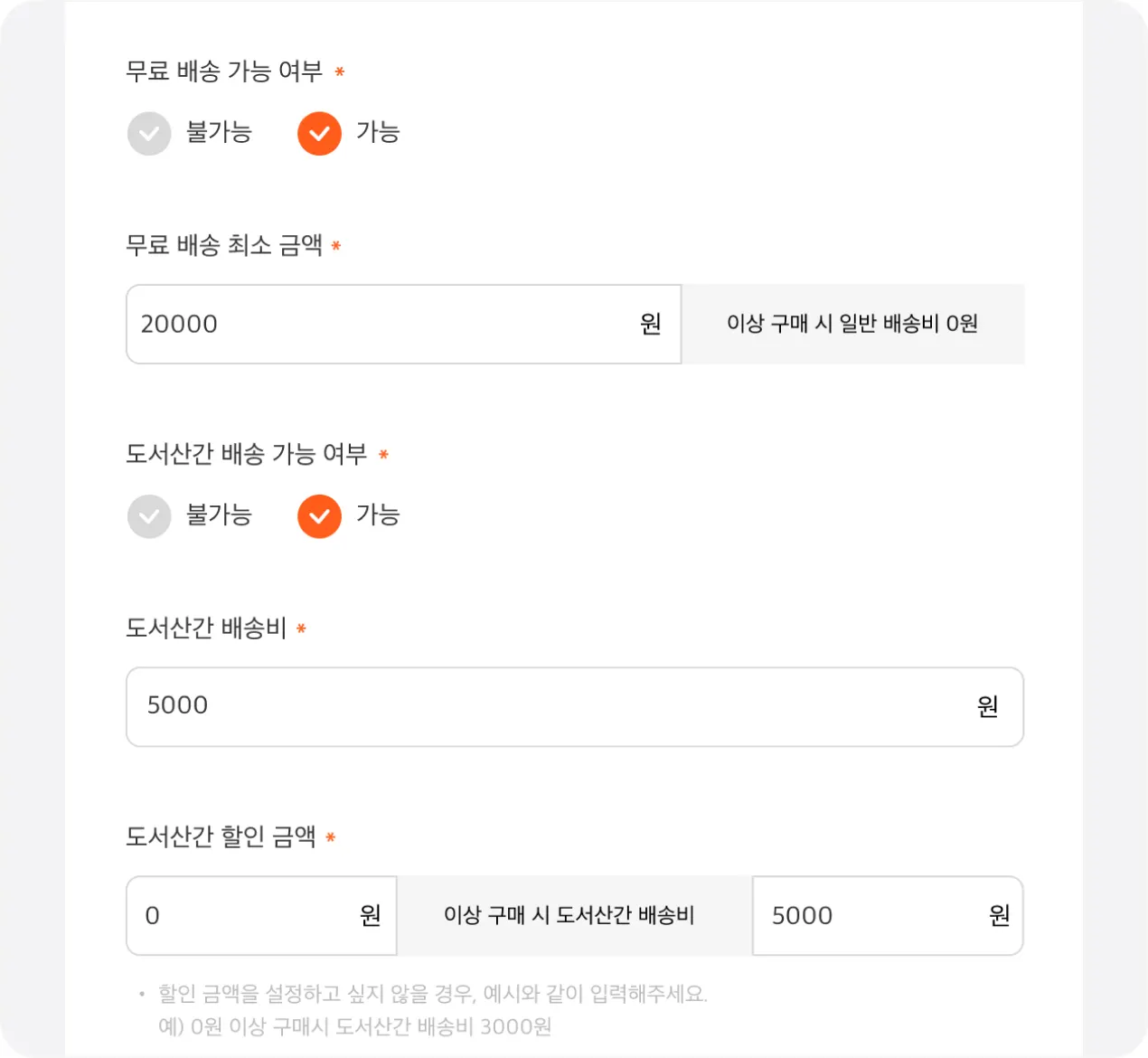도서산간 배송 가능 여부: 도서산간 지역 배송이 가능한지 여부를 설정해 주세요!