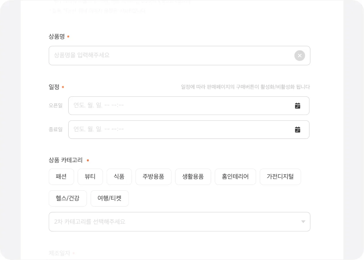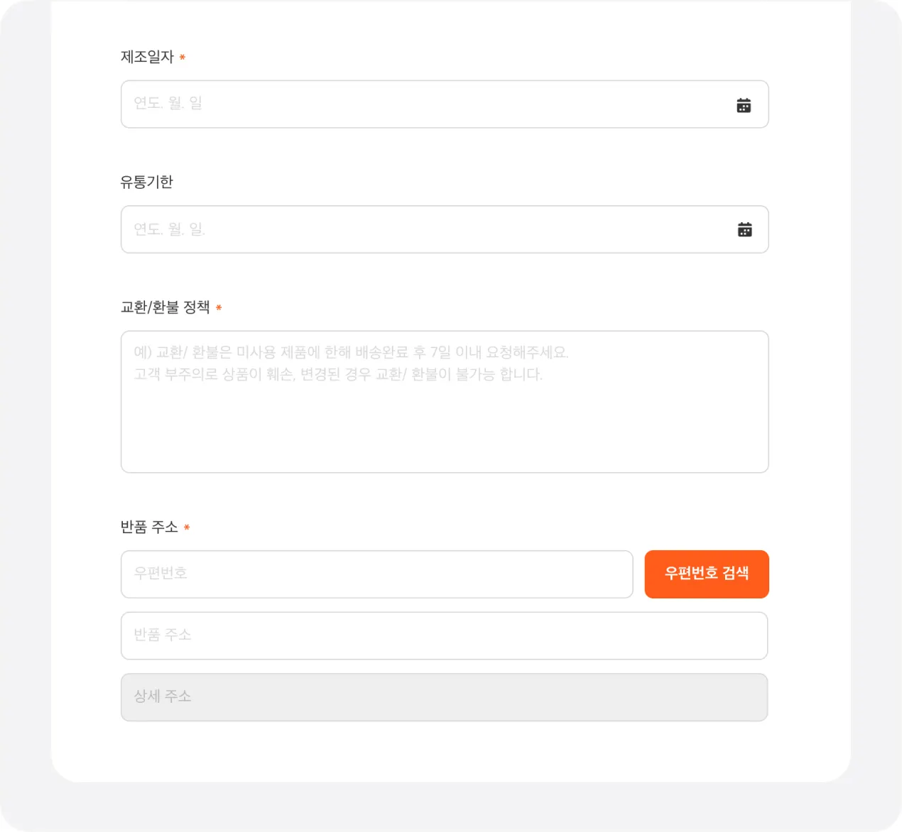 상품의 [이미지, 상품명, 일정, 카테고리, 제조일자, 유통기한, 교환·환불 정책, 반품 주소]를 입력하면 판매를 위한 기본 세팅이 완료돼요!