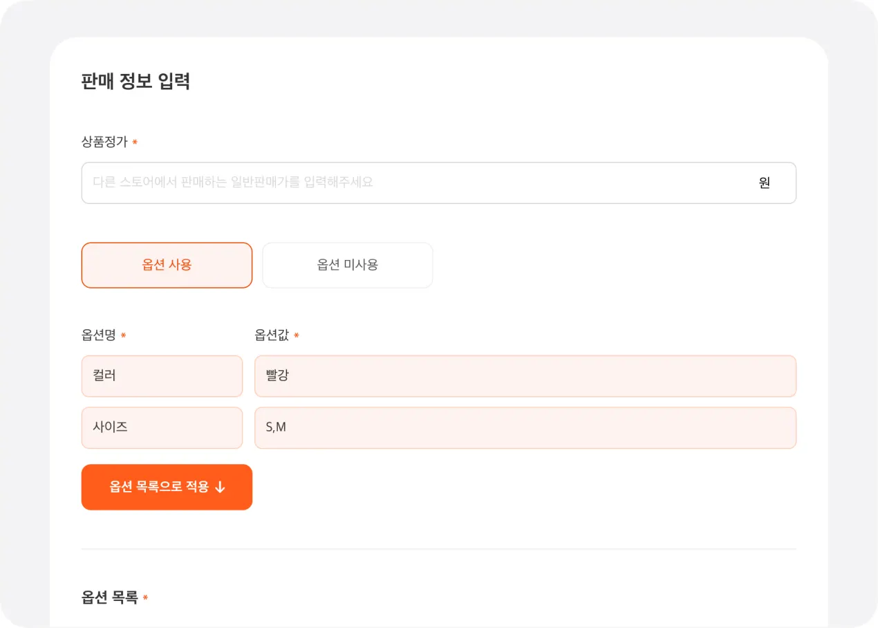 상품의 정가와 다양한 옵션 정보를 입력할 수 있는 곳이에요!