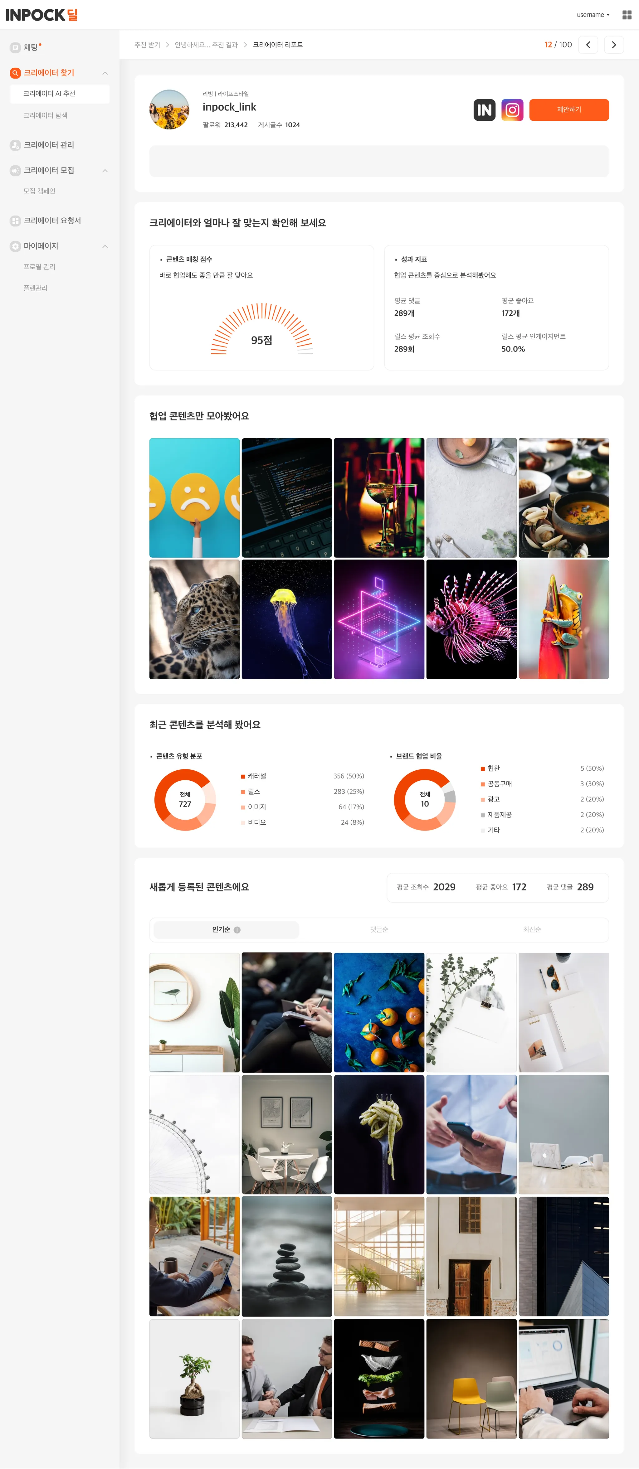 AI가 해당 크리에이터의 콘텐츠 스타일과 브랜드의 캠페인 목적을 분석해 적합도를 수치화합니다.