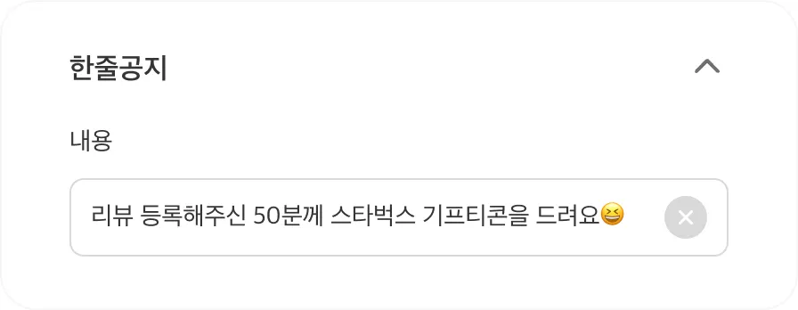 마켓 상단에 표시되는 공지 문구로, 텍스트가 길면 자동으로 흘러가며 보여집니다!