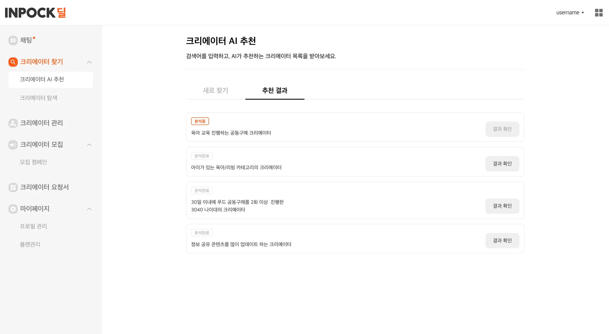 AI가 추천한 크리에이터 1차 리스트를 확인 할 수 있습니다.