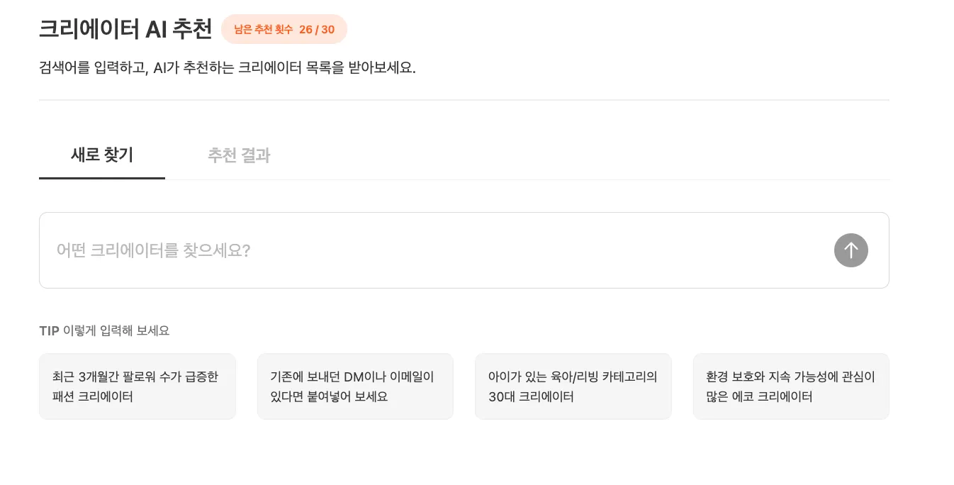 1단계 | 가능한 상세하고 명확한 문장으로 원하는 크리에이터 유형을 검색 |