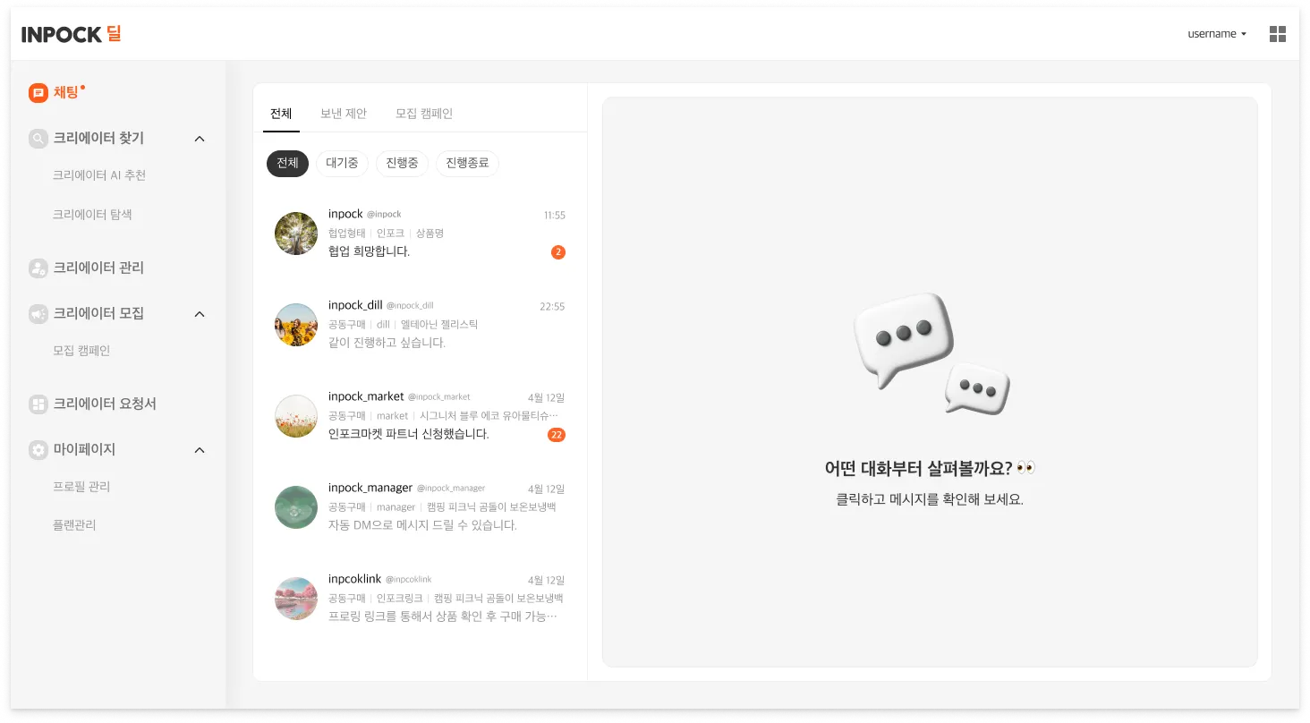 협업 제안이 수락되면 자동으로 채팅방이 열리고, 인포크링크 내에서 실시간 대화를 나눌 수 있어요.
