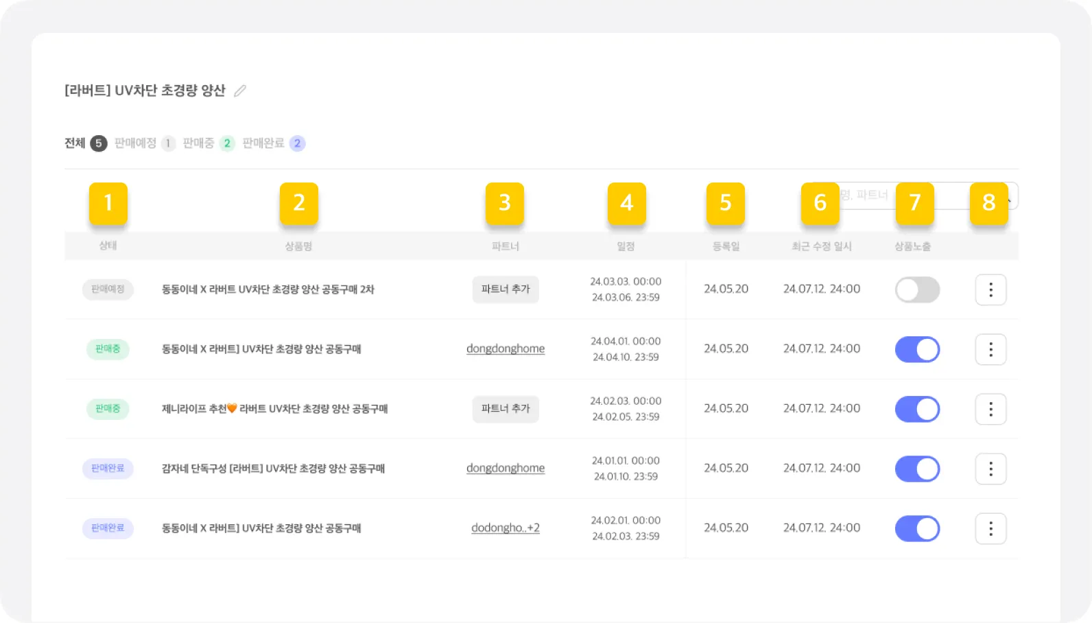 상품의 상태, 상품명, 파트너, 일정, 등록일, 최근 수정 일시, 상품 노출 여부, 더보기(수정/판매페이지)을 손쉽게 관리할 수 있답니다!