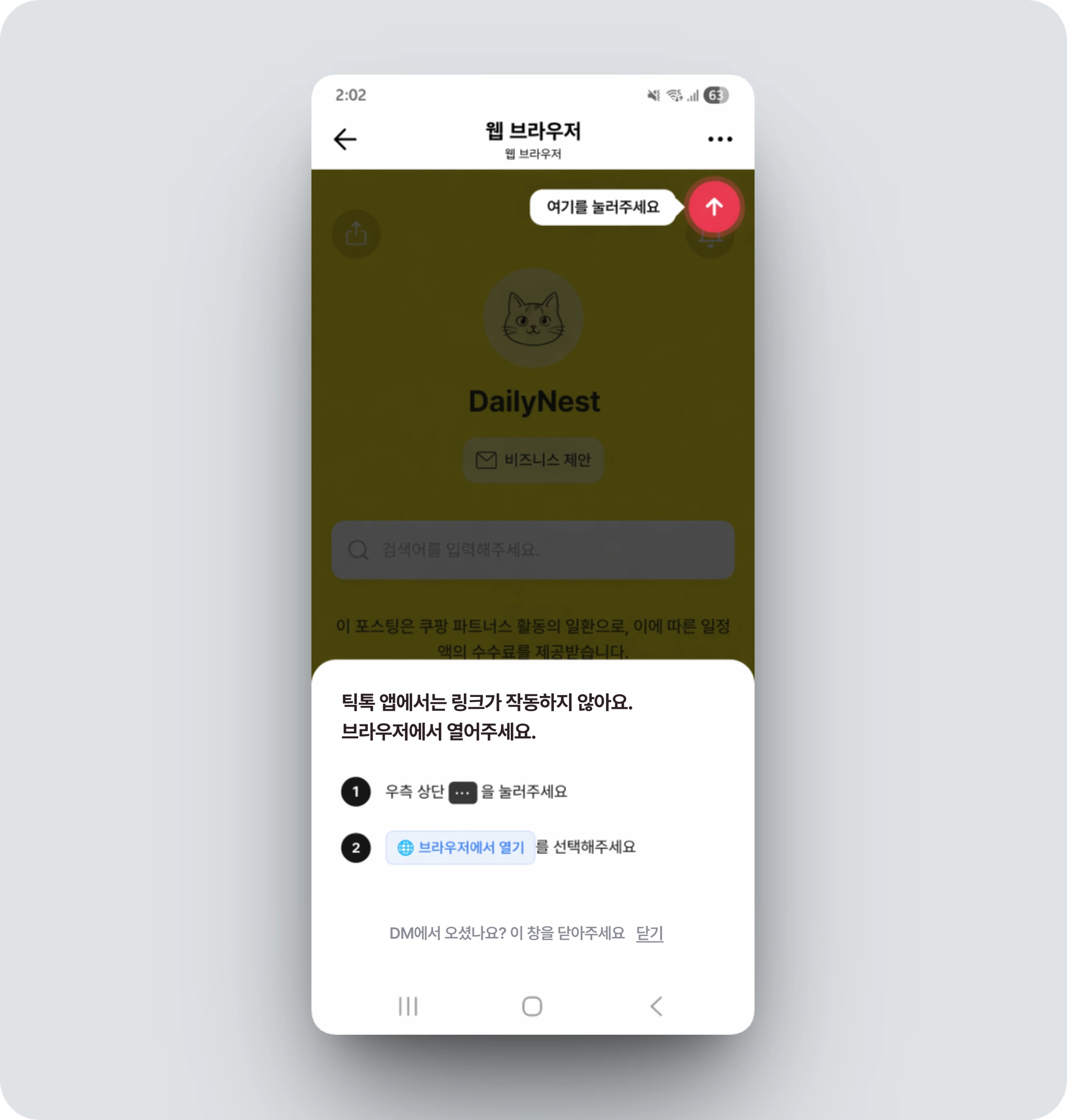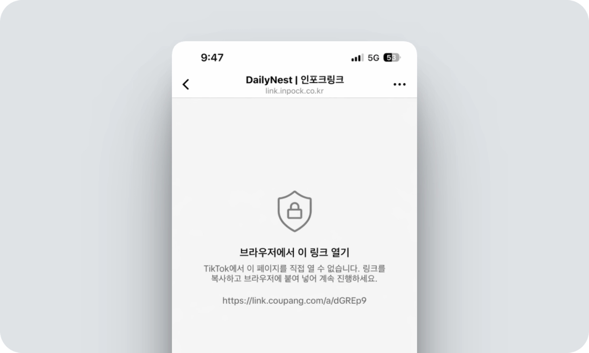 틱톡 내부 브라우저의 제약: 쿠팡 등 일부 상품 링크는 틱톡 앱 안에서 열리지 않아요. 팝업이 꺼져 있으면 팔로워가 상품 링크를 눌렀을 때 링크를 수동으로 복사해 브라우저에 붙여넣어야 해요.