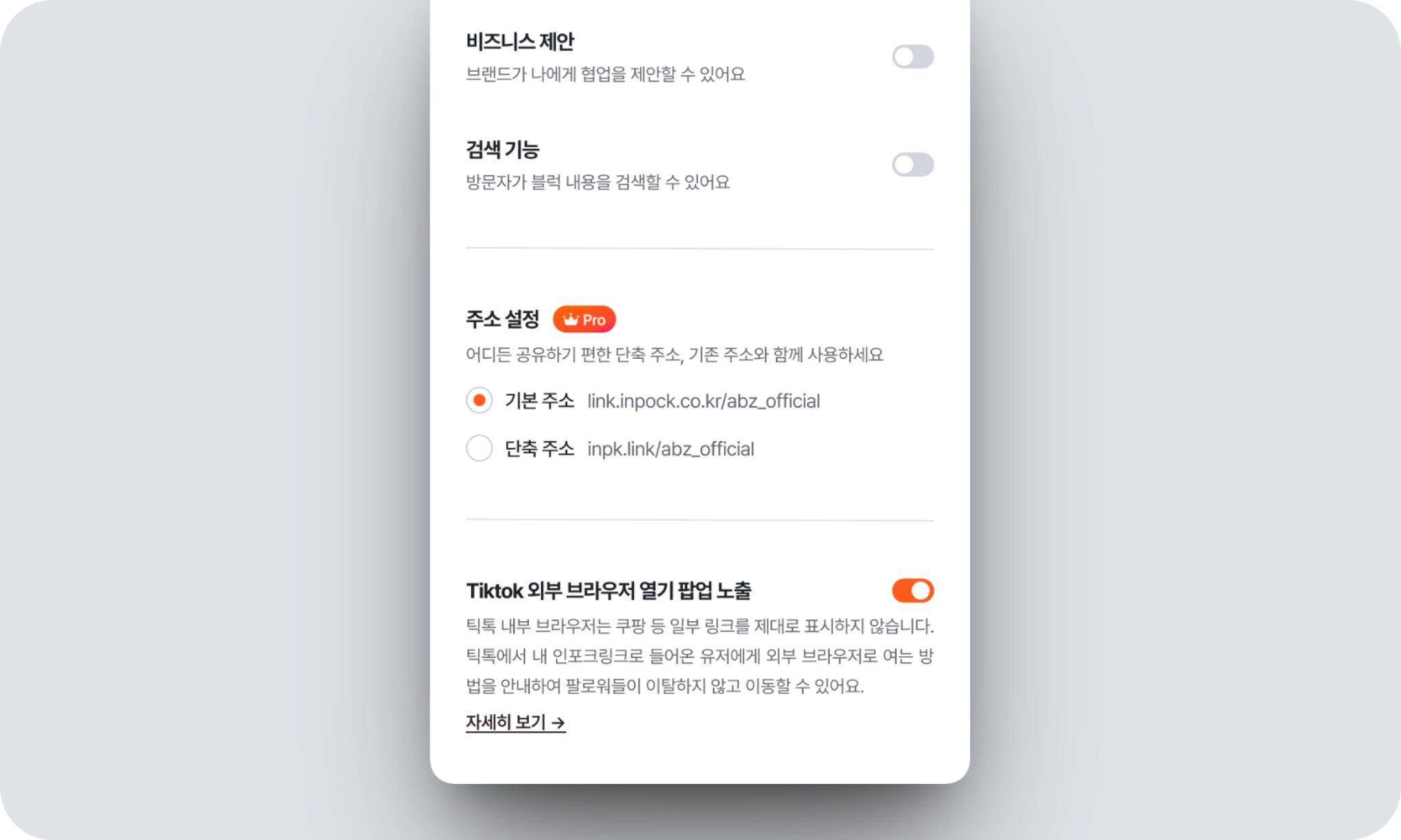 기본값은 '꺼짐'이에요: 팝업 노출을 원하시면 설정에서 켜주세요. 특히 틱톡 프로필을 통한 유입이 많다면, 켜두시는 것을 권장드려요.